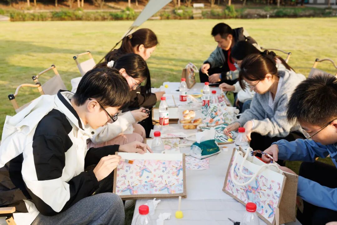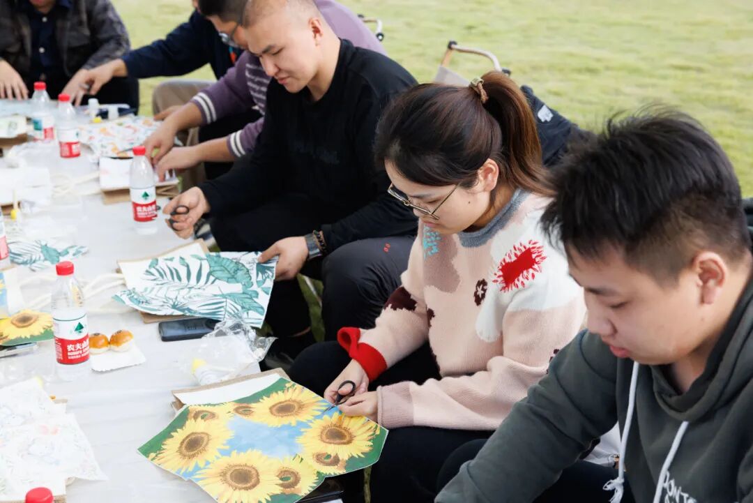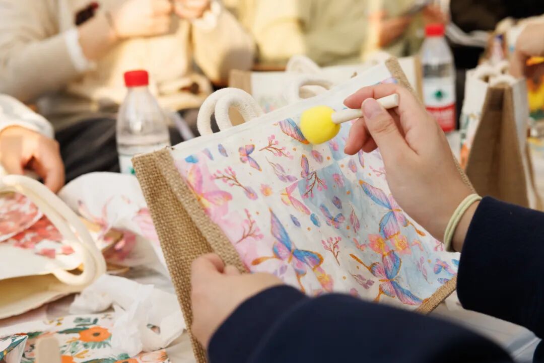 热身之后,便进入了今天的主旋律——蝶谷巴特手工包创作。青年朋友们从了解这门源自欧洲的剪贴艺术开始,一步步挑选心仪的印花图案,小心翼翼地裁剪,在纯色帆布包上精心构思布局……夏日的花朵、繁茂的枝叶、充满异域风情的图案,在大家的巧手下,被永恒地封存在帆布包上,化作了独一无二的秋日风景。